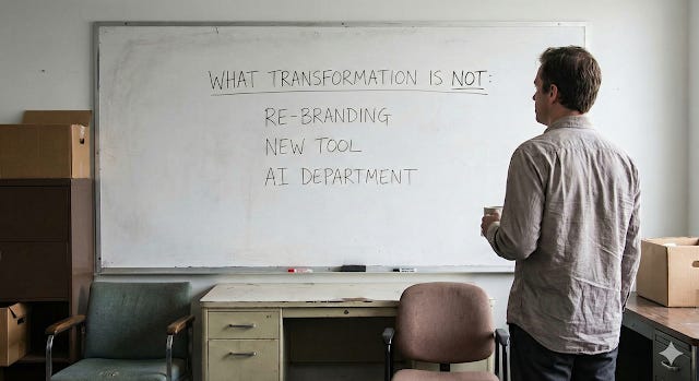 Have you ever tought what it means to transform? What it means to make things different. IF transform means rename the things we always did (re-brand) I tell you, this is not transformation. IF transformation means adding a tool, that’s not transformation. IF transformation means: An AI Team, an AI Department, and an AI Enterprise tool, that’s not transformation.